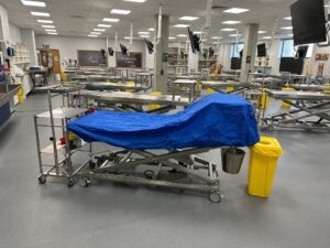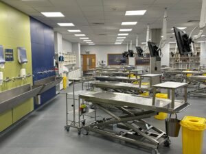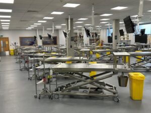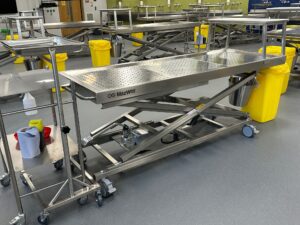 We supplied the tables with a bridge type cut up board/instrument table, that can slide over the cadaver/specimens.
